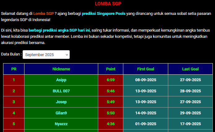 Di sini, kita bisa berbagi prediksi angka SGP hari ini, saling tukar informasi, dan memperkuat kemungkinan angka tembus lewat kolaborasi prediksi antar member. Lomba ini bukan sekadar kompetisi, tetapi juga komunitas untuk meningkatkan akurasi prediksi bersama.